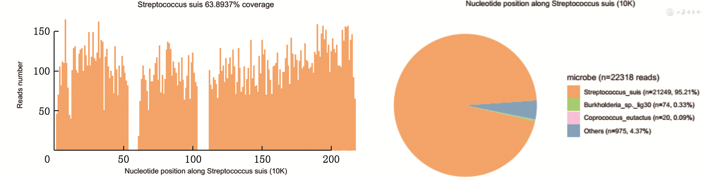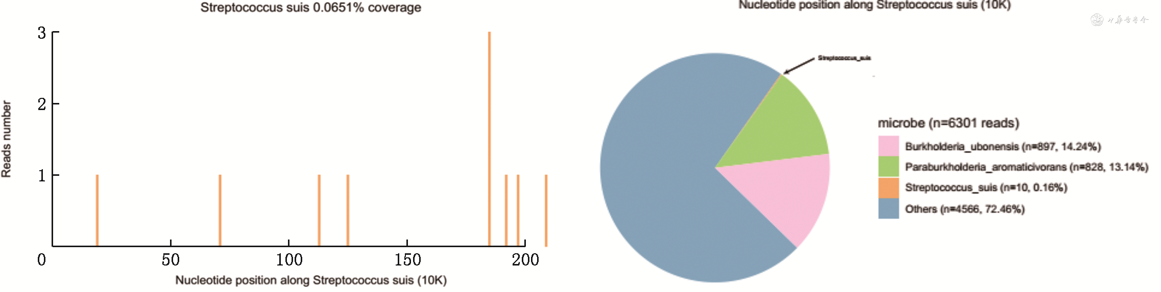 患者男性,36岁,因间断头痛发热5 d,听力下降4 d,进行性意识不清3 d于2020年11月12日入院,家属代诉入院前5 d患者晨起后自觉发烧,伴轻度头痛,自测体温38.1℃,遂自服对症药物治疗后症状略缓解,患者夜间头痛症状加重,伴恶心呕吐,且体温维持在38.4~39.1℃,口服“芬必得”后头痛症状缓解。次日晨起患者自觉双侧听力明显下降,伴左侧耳痛。入院前3 d患者头痛症状加重,波及全头,呈持续性头痛,遂即前往当地就诊,行血常规+C反应蛋白(CRP)检查:白细胞计数 40×109/L,中性粒细胞比率92%,CRP 64 mg/L,予以注射用青霉素钠静脉输注,住院期间患者意识程度进行性加重,家属代诉患者多为昏睡状,不易叫醒,家属为求进一步治疗诊治,急诊以“发热原因待查 颅内感染待排”转入兰州大学第二医院。患者平素体健,从事养殖厂运输工作。入院体格检查:体温 39.4 ℃,脉搏 82 次/min,呼吸 25 次/min,血压 132/90 mmHg(1 mmHg=0.133 kPa),体重 83 kg;发育正常,营养中等,心肺腹查体未见明显异常。神经系统查体嗜睡状,高级皮质功能及颅神经查体欠配合;四肢肌力4+级,肌张力正常,腱反射存在,未查及病理征。感觉、共济查体无法配合。颈强直,颏胸距4指,Kernig征(+),Brudzirnki征(+)。入院急查血常规+CRP:白细胞计数 WBC 27.41×109/L,中性粒细胞比率82%,CRP 62 mg/L,尿粪常规未见明显异常;生化检查各项指标均未见明显。D-二聚体 1.36 μg/ml。入院拟诊断:中枢神经系统感染,原因待查。当天行腰椎穿刺术化验脑脊液:颅内压320 mmH2O(1 mmH2O=0.009 8 kPa),潘氏试验阳性,白细胞数 1 980×106/L,多个核细胞百分比(PMN)72 %;蛋白>3.0 g/L,氯化物 121.0 mmol/L,糖 1.6 mmol/L,脑脊液抗酸墨汁、新型隐球菌涂片及一般细菌涂片均为阴性,同时留取4 ml 脑脊液和4 ml血液送北京予果生物科技北京有限公司行二代测序(next-generation sequencing,NGS)检查明确病原微生物种类,同时送血液、脑脊培养。入院经验性地予以注射用头孢曲松钠2 g,每日一次,静脉缓慢输注,地塞米松 10 mg每日一次,静脉缓慢输注;11月13日白细胞计数11.18×109/L,中性粒细胞比率70%,传染病检测肝炎八项、人类免疫缺陷病毒抗体测定、梅毒螺旋体特异性抗体测定均未见明显异常;风湿免疫组套、TORCH组合、呼吸道九项检测、结核抗体测定阴性,血培养及脑脊液未见异常。复查脑脊液:颅内压290 mmH2O,潘氏试验阳性,白细胞数 869×106/L,PMN 68%;蛋白 2.21 g/L,氯化物 120.0 mmol/L,糖 1.9 mmol/L,脑脊液抗酸墨汁、新型隐球菌涂片及一般细菌涂片均为阴性。患者头颅磁共振未见明显异常。考虑到临床症状改善,意识状态正常,再继续头孢曲松钠及地塞米松联合使用的基础上实验性增加左氧氟沙星输注。11月16日白细胞计数12.55×109/L,中性粒细胞比率66%,复查脑脊液示颅内压260 mmH2O,潘氏试验阳性,白细胞数 94×106/L,PMN 22%;蛋白 0.82 g/L,氯化物 115.5 mmol/L,糖 2.6 mmol/L,脑脊液抗酸墨汁、新型隐球菌涂片及一般细菌涂片均为阴性,血培养未见异常。同日脑脊液NGS结果回报猪链球菌(Streptococcus suis)检出序列为21 249,覆盖度63.893 7%(图1),血液NGS结果示检出序列为6 301,覆盖度0.065 1(图2),未检出背景微生物。目前患者长期养殖厂工作,入院脑脊液常规生化符合细菌性颅内感染,结合脑脊液NGS结果提示猪链球菌,确诊为中枢神经系统感染 猪链球菌脑膜炎(Streptococcus suis meningitis,SSM)。11月23日复查腰椎穿刺术化验脑脊液示颅内压170 mmH2O,潘氏试验阳性,白细胞数12×106/L,PMN65%;蛋白0.36 g/L,氯化物 119.1 mmol/L,糖 2.2 mmol/L,脑脊液抗酸墨汁、新型隐球菌涂片及一般细菌涂片均为阴性;血常规体示白细胞计数 6.2×109/L,中性粒细胞比率61%。除双侧听力障碍外其余临床症状消失,遂即出院,定期随访。