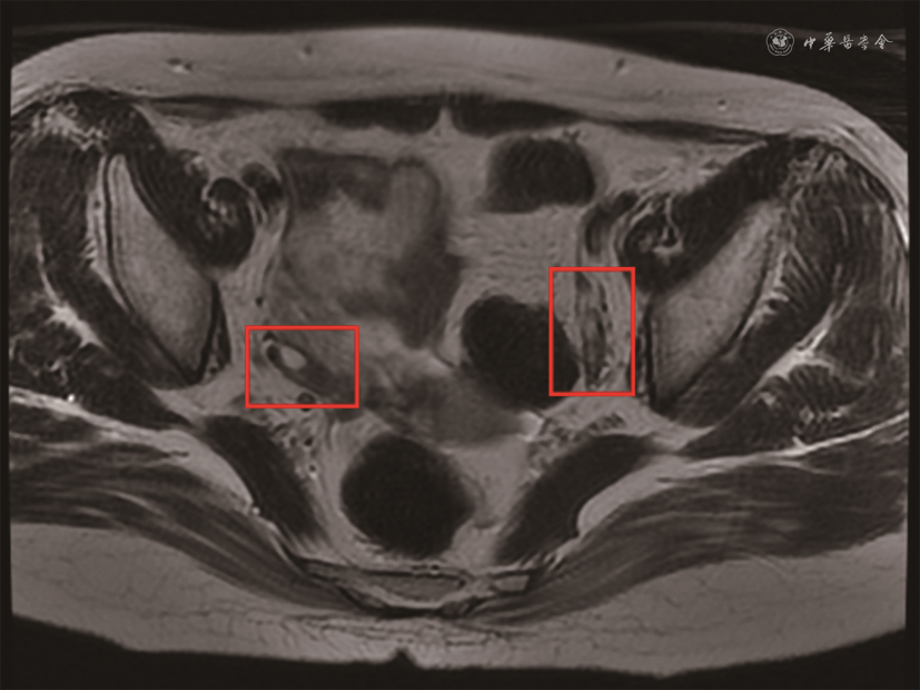 入院体检:血压 106/70 mmHg(1 mmHg=0.133 kPa),脉搏94次/min,呼吸20次/min,心率94次/min;心、肺未见明显异常,对答切题,言语稍慢,右侧鼻唇沟稍浅,示齿口角稍偏左,右上肢近端肌力Ⅴ-级,远端肌力Ⅳ级,腱反射较对侧活跃,右手除拇指外4指掌侧针刺觉减退,右上肢指鼻欠稳准。入院后查血常规,白细胞3.81×109/L,血红蛋白132 g/L,血小板193×109/L;尿常规,尿蛋白、尿潜血(-),24 h尿蛋白0.13 g;肝肾功能,白蛋白43 g/L,肌酐43 μmol/L,尿酸278 μmol/L;总胆固醇3.08 mmol/L,甘油三酯0.66 mmol/L,低密度脂蛋白胆固醇1.15 mmol/L;凝血酶原时间12.1 s(参考值10.4~12.6 s),活化部分凝血酶原时间26.8 s(参考值23.3~32.5 s),国际标准化比值1.05(参考值0.86~1.14),纤维蛋白原2.85 g/L(1.80~3.50 g/L),D-二聚体0.15 mg/L FEU(参考值0~0.55 mg/L FEU);同型半胱氨酸15.1 μmol/L(参考值<15.0 μmol/L),叶酸5.1 μg/L(参考值>4.0 μg/L),维生素B12 246 ng/L(参考值180~914 ng/L);易栓症筛查,蛋白C 119%(参考值70%~140%),蛋白S 62%(参考值76%~135%),活化蛋白C抵抗比值为2.9(参考值>2.1),抗凝血酶Ⅲ 116%(参考值83%~128%);性激素,LH 60.21 IU/L(绝经期10.87~58.64 IU/L),FSH 79.84 IU/L(绝经期>40.00 IU/L),雌二醇34 ng/L(绝经期<40 ng/L),孕激素0.24 μg/L(绝经期<0.78 μg/L),睾酮<0.1 μg/L(0.10~0.75 μg/L);红细胞沉降率(ESR)24 mm/1h,IgG 20.66 g/L,超敏C反应蛋白(CRP)0.28 mg/L;补体C3 1.125 g/L,补体C4 0.116 g/L;抗核抗体 1∶640(均质型),抗双链DNA抗体(ELISA)169 IU/ml,抗Sm抗体阴性,抗SSA抗体强阳性(免疫印迹法90),抗心磷脂抗体(ACL)-IgG阳性 94.9~95.2 GPLU/ml(参考值<8.0 GPLU/ml),抗β2糖蛋白Ⅰ(β2GPⅠ)抗体-IgG阳性 38.2~39.9 AU/ml(参考值<16.0 AU/ml),狼疮抗凝物(LA)阴性,抗中性粒细胞胞质抗体阴性。子宫双附件超声检查(经腹):子宫、双卵巢体积稍小。经颅多普勒发泡试验示,双侧大脑中动脉可见约4个微栓子信号;头颅MRA及磁共振静脉造影(MRV)未见明显异常。综合患者临床表现及自身抗体检查结果,符合系统性红斑狼疮(SLE)、抗磷脂综合征(APS)诊断,合并急性卒中,立即停用性激素替代治疗,加强脑血管病二级预防治疗,予阿司匹林(100 mg,1次/d,口服)、阿托伐他汀(20 mg,1次/d,口服)治疗;针对SLE、APS,予泼尼松(60 mg,1次/d,口服)、吗替麦考酚酯(0.75 g,2次/d,口服)、羟氯喹(0.2 g,2次/d,口服)治疗。此后患者神经系统症状恢复正常,言语流利。泼尼松规律减量(每周减量5%),期间未使用性激素替代治疗。2019年12月北京协和医院门诊查卵巢MRI示,子宫、双侧卵巢形态小,右卵巢可见一小卵泡影(图1)。2020年1月10日泼尼松减至10 mg、1次/d时患者月经来潮,复查LH 6.06 IU/L(卵泡期2.40~12.60 IU/L),FSH 11.01 IU/L(卵泡期3.50~12.50 IU/L),雌二醇31.9 ng/L(卵泡期12.4~233.0 ng/L),孕酮0.218 μg/L(卵泡期 0.057~0.894 μg/L)。此后规律行经至今,行经天数3~4 d,月经周期28 d,经量正常。