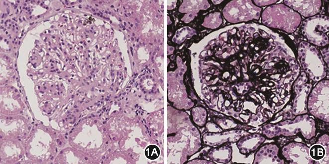 患者男,43岁。因尿中泡沫增多、水肿2月余于2018年3月1日收入我院肾内科。患者2018年1月发现尿中泡沫增多,伴一过性双踝可凹性水肿。2018年2月就诊我院门诊,测血压120/80 mmHg(1 mmHg=0.133 kPa),查血白蛋白34 g/L,血肌酐89 μmol/L;尿常规:蛋白1.0 g/L,潜血25个细胞/μl;24 h尿蛋白定量4.66 g;抗M型磷脂酶A2受体(PLA2R)抗体水平25.3 EU/ml;血免疫固定电泳、尿免疫固定电泳、抗核抗体、抗双链DNA抗体、抗可溶性核抗原抗体、乙型肝炎病毒表面抗原及丙型肝炎病毒抗体均未见异常。泌尿系超声检查示,双肾长径10~11 cm,皮质厚0.7~0.8 cm。考虑特发性膜性肾病(MN),予口服泼尼松40 mg 每日1次,环孢素A 100 mg每日2次,氯沙坦100 mg每日1次治疗。患者仍间断出现双踝一过性水肿,2018年2月复查血白蛋白27 g/L,24h尿蛋白定量7.4 g,抗PLA2R抗体水平18.3 EU/ml,为进一步诊治收入我院。既往史:否认高血压、糖尿病、肝炎及结核病史。入院体检:体温36.3 ℃,血压117/81 mmHg,呼吸18次/min,脉搏88次/min;神志清楚,自主体位,安静面容,查体合作;全身浅表淋巴结未及肿大;眼睑无水肿;心律齐,各瓣膜区无病理性杂音;双肺呼吸音清;腹软,无压痛、反跳痛及肌紧张,腹部移动性浊音叩诊阴性,双侧肾区无叩痛,肠鸣音正常;双下肢未及可凹性水肿;四肢肌力及肌张力正常,双侧巴宾斯基征阴性。