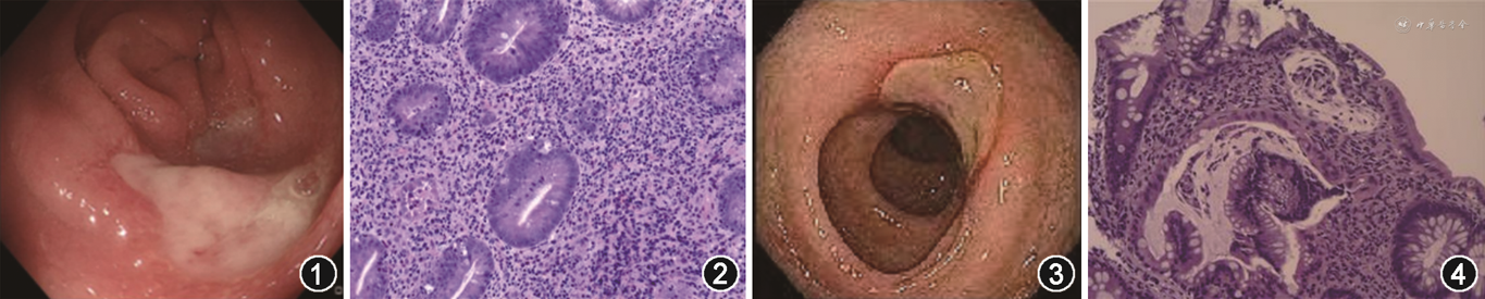 辅助检查:粪便常规、细菌培养及寄生虫检查阴性。HIV、HSV、弓形虫抗体、CMV、EBV、风疹病毒、T-SPOT检测均为阴性。生化示球蛋白低,血清免疫球蛋白G、A、M减少,B淋巴细胞减少,CD4+/CD8+T淋巴细胞比值倒置(表1)。痰培养:未培养出细菌;免疫全套ANA、ENA多肽抗体谱阴性;胸部CT:右下肺炎症。胃镜:慢性非萎缩性胃炎,肠镜:结直肠多发溃疡(图3),病理示黏膜慢性炎症,伴炎性肉芽组织形成,未见明确浆细胞(图4)。结合患者既往胸腺瘤手术病史,反复感染表现,免疫球蛋白G、A、M降低,B淋巴细胞计数降低,CD4+/CD8+T淋巴细胞倒置,最终诊断Good综合征,在给予静脉注射免疫球蛋白(10 g/d,3 d)后,患者腹泻症状较前改善,解黄色成形便1 次/d。