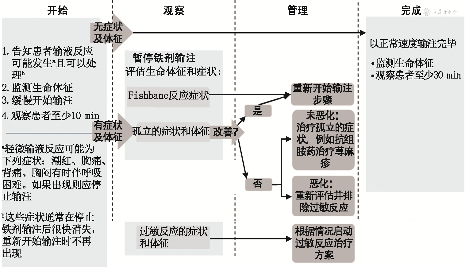 对静脉铁剂输液反应的管理,关键在于减轻患者和医护人员的顾虑、减缓输注速度、识别是Fishbane反应症状、孤立的症状/体征还是过敏反应症状,并给予适当治疗,以消除紧张甚至误判为严重过敏反应而导致过度治疗。图1是在参照国际公认的输液反应管理流程[41]基础上提出的简化流程图,以方便协助医护人员对急性输液反应进行规范化管理,供临床参考。