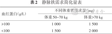 (3)静脉铁剂剂量:传统使用Ganzoni公式计算铁需求量,但该公式易出现误差,且可能低估铁需求量[23]。国内外指南/共识多支持使用简化的估算量表[25,28, 29](表2),即根据患者体重和Hb估计总铁需求量。研究证实,治疗后SF>400 μg/L能预防未来1~5年内缺铁的复发,因此建议这类患者补铁目标为SF超过400 μg/L。