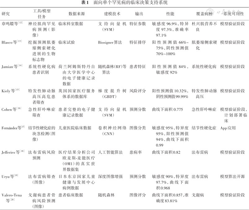 1.面向单个罕见病的CDSS:面向单个罕见病的CDSS主要使用机器学习模型,从电子病历等真实世界数据中挖掘出隐藏的患者表型,为疾病诊断提供更丰富的知识源。Jefferies等[18]建立了一个大样本法布雷病的队列(4 978例患者),从患者病历中提取出数百个疾病表型并进行机器学习模型校准,该模型通过计算测试集中的患者表型与法布雷病表型的对应性,筛选出高危患者。结果显示,人工智能工具在使用结构化病历数据识别法布雷病方面表现出色(AUC为0.82)。Uryu等[19]在后续研究中,为解决罕见病病例不足的难题,开发了一种新的图像增强方法,对有限的图像数据进行人工扩张,提高算法模型的泛化能力,该模型可从尿沉渣图片中识别未确诊的法布雷病患者,敏感度为90%,AUC为0.968,目前研究人员已将这项算法开源在Github平台(https://github.com/huryu/DL_Fabry)。