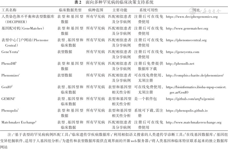 2. 面向多种罕见病的CDSS:面向多种罕见病的CDSS,主要是基于人类表型本体(human phenotype ontology,HPO)、在线人类孟德尔遗传病(online Mendelian inheritance in man,OMIM)等数据库开发的Web应用程序,如2000年以来相继出现人类染色体不平衡和表型数据库(DECIPHER)、基因配对机(GeneMatcher)、利用相似语义搜索人类遗传学诊断工具(Phenomizer)等(表2),现已构建完善,可免费供医生和研究人员使用,针对所有罕见病范围进行预测,辅助医生进行罕见病基因型与表型信息的整合分析。