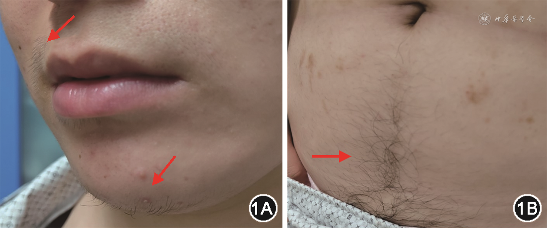 入院查体:身高167 cm,体重79 kg,体重指数28.32 kg/m2,腰围85 cm,臀围97 cm;卧位血压140/90 mmHg(1 mmHg=0.133 kPa),立位血压142/89 mmHg。上唇、下颌、腹白线、大腿内侧可见终毛(图1),颈部、腋下、腹股沟皮肤未见明显黑棘皮征;无满月脸、水牛背及皮肤紫纹,体型均匀,双下肢无浮肿。未见全身及部分皮下脂肪萎缩。患者入院后完善病因筛查:HbA1c 9.5%;正常餐试验示空腹、餐后1 h及餐后2 h血糖分别为12.89、18.05、21.91 mmol/L,C肽分别为3.41、4.47、5.75 μg/L,胰岛素分别为28.21、46.96、63.59 mU/L。嘱患者控制饮食,给予二甲双胍0.5 g 4次/日,恩格列净10 mg 1次/日,阿卡波糖100 mg 3次/日,吡格列酮15 mg 1次/日,门冬胰岛素24 U 三餐前、甘精胰岛素(U300)20~24 U 1次/晚皮下注射治疗(腹部、臀部、上臂多部位轮换皮下注射),监测空腹血糖波动在11~25 mmol/L、餐后2 h血糖波动在16~25 mmol/L,无夜间低血糖发生;经生酮饮食后患者血糖仍未见明显下降。性腺激素示:睾酮2.76 nmol/L(0.31~1.66 nmol/L)(括号内为正常参考值,下同),黄体生成素10.07 U/L(1.5~33.4 U/L),卵泡刺激素8.68 U/L(1.5~33.4 U/L),泌乳素17.53 μg/L(2.8~29.2 μg/L);妇科超声示卵巢多囊样改变,提示患者月经紊乱及多毛为胰岛素抵抗导致的PCOS所致。