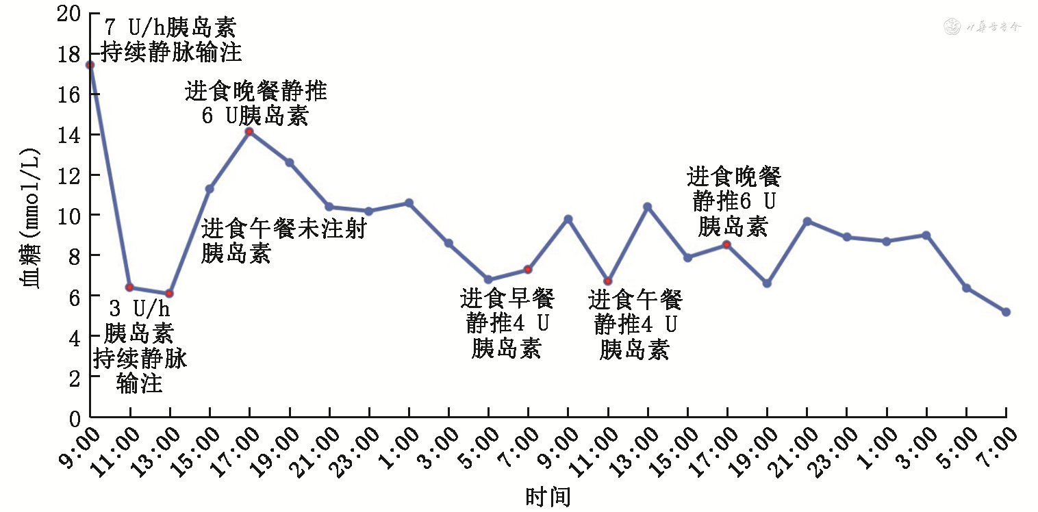 胰岛素抵抗定义为由于各种原因导致胰岛素靶组织在血浆胰岛素浓度升高时不能充分处理血糖、抑制内源性葡萄糖产生和脂解以及刺激糖原合成的能力[1]。超重或肥胖、糖耐量异常、T2D等病理状态下可伴有不同程度的胰岛素抵抗;内分泌疾病导致的胰岛素拮抗激素水平升高、胰岛素药代动力学异常、胰岛素信号传导缺陷、部分或全身脂肪营养不良、一些复杂综合征(Alstrom综合征、强直性肌营养不良症、先天性肌纤维类型不均衡肌病、Werner综合征等遗传性综合征)均可导致胰岛素抵抗的发生[2]。本例患者皮下注射2.21 U‧kg-1‧24 h-1胰岛素血糖控制不佳,提示存在严重胰岛素抵抗。经相关实验室检查排除了内分泌疾病导致的胰岛素拮抗激素水平升高所致的胰岛素抵抗;胰岛素水平仅轻度升高且基因突变未见异常,不支持遗传性疾病所致的严重胰岛素抵抗;皮下胰岛素抵抗而静脉胰岛素效果佳提示为胰岛素药代动力学异常即SIRS导致的胰岛素抵抗。