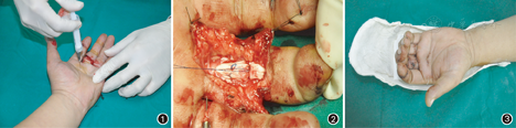 麻醉满意后,患者取仰卧位,常规消毒铺无菌单。术中首先对左示、中、环指伤口进行清创,去除污染组织。探查见左示、中指桡侧指神经分别于伤口处完全断裂,左中指深屈肌腱于A2滑车以远处断裂。术中以左中指伤口为中心分别向远端和近端做"Z"字形切口(Bruner切口)。切口远端至近侧指横纹,近端至远侧掌横纹。切开皮肤,分离皮下组织,保护双侧指动脉和神经,将皮肤和皮下组织牵拉向两侧暴露屈肌腱鞘和A2、C1、A3滑车。术中见A2滑车以远腱鞘横行裂口,屈指深肌腱远侧断端位于A2滑车以远,近侧断端回缩,因此屈曲掌指关节和腕关节后未在A2滑车内探及。遂沿滑车掌侧中线打开1/2长度的A2滑车,并于远侧掌横纹处做0.5 cm横行切口,分离皮下组织,探查并暴露左中指屈指深肌腱。将其近侧断端牵出,由腱鞘和滑车内自近端回送入A2滑车远端。屈曲左中指使肌腱两断端靠近并对合后,使用注射器针尖临时固定,见肌腱断端整齐。