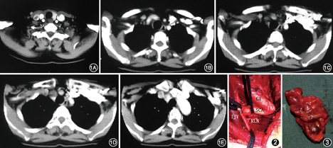 完善术前准备,于2014年3月5日全身麻醉下,按原手术切口,沿皮纹向右延伸至右斜方肌前缘,颈阔肌下翻起皮瓣,行保留胸锁乳突肌、颈内静脉和副神经的Ⅱ~Ⅴ区清扫;解剖左喉返神经,保护左侧上下甲状旁腺后,行甲状腺左叶切除;解剖出右颈总动脉、颈内静脉、右锁骨下动脉、无名动脉和右无名静脉,经颈部将气管前及右上纵隔淋巴脂肪组织整块切除,完成经颈部右上纵隔清扫(图2,图3)。术后病理学检查结果:淋巴结转移性甲状腺髓样癌;淋巴结转移7/44,部分累及淋巴结被膜外,右颈Ⅱa区淋巴结2/5,右颈Ⅱb区淋巴结0/6,右颈Ⅲ区淋巴结4/14,右颈Ⅳ区淋巴结0/2,右颈Ⅴ区淋巴结0/15,上纵隔淋巴结1/2;免疫组化:癌胚抗原(+++),Syn(+++),CD56(+++),TT1(+++),甲状腺球蛋白(–);甲状腺左叶:结节性甲状腺肿;气管前清扫:术后改变,未见癌。