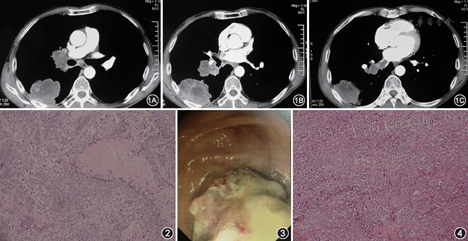 男性,54岁,因"咳嗽伴劳力性呼吸困难3个月"于2012年7月4日入院。既往吸烟史30余年,约1包/d。入院前在外院行胸部CT增强扫描,提示"右肺下叶外周型肺癌,侵犯后胸壁及肋骨;伴肺门巨大融合淋巴结,侵犯肺动脉主干和肺静脉心房起始部;双肺弥漫小叶中心型肺气肿"(图1)。入院后进一步检查全身骨扫描、头部MRI、腹部CT及颈部B超等,均未见异常,临床诊断为局部进展期肺癌(T4N1M0)。考虑到肺门融合巨大淋巴结完全压迫及堵塞右侧肺动脉干及肺静脉根部,化疗药难以通过肺循环到达肿瘤区域,故未行术前化疗。患者于2012年7月13日在全身麻醉下行扩大肺癌根治手术,心肺转流(股动静脉转流)辅助下行右全肺、部分左心房及部分胸壁切除,纵隔淋巴结系统清扫术,术后恢复顺利,于术后15 d出院。术后病理提示为肺大细胞癌局部伴神经内分泌分化,原发瘤11.0 cm×6.0 cm,肺门融合淋巴结7.0 cm×6.5 cm,纵隔各组淋巴结(-),术后病理分期亦为T4N1M0(图2)。