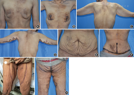 2014年2月12日患者在全身麻醉下行双上肢及双侧乳房皮肤松弛畸形整形术。术前外展抬高双臂90°,沿尺侧设计W形切口,标记需切除松弛皮肤面积。在乳头与胸骨切迹中点连线上方18 cm处设计新的乳头位置,采用垂直单蒂法切除乳房区多余松弛皮肤[1],术区注射含1∶200 000肾上腺素的生理盐水以减少术中出血量。双上臂手术于浅筋膜层进行分离,切除多余松弛皮肤,Z形缝合切口,术后加压包扎(图1)。