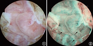 窄带光下观察膀胱肿瘤图像(箭头所示为微小肿瘤)
