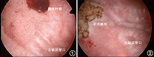 拍摄原理及技巧:采用OLYMPUS高清摄像头,生理盐水持续灌洗作为介质,光源亮度调整至中等强度,采用调焦旋钮调整好镜头焦距,使肿瘤清晰呈现在镜头前,保持稳定状态进行拍摄。
