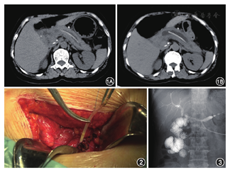术后第1天实验室检查结果:白细胞计数8.95×109 g/L,红细胞计数3.65×109 g/L,血红蛋白107 g/L,血小板计数124×109g/L;血淀粉酶303.0 U/L,血脂肪酶785.6 U/L。腹部CT检查结果显示,与术前比较,术区结构清晰,主胰管扩张情况较前明显减轻,原胰管内导管已消失,胰周渗出灶较前吸收,左侧肾前筋膜无明显增厚,余况同前。患者术后腹痛消失,恢复良好。术后2个月复查T管造影提示"胰十二指肠切除术后",经T管注入造影剂,未见胆囊显影,左右肝管及其肝内分支、肝外胆管显影良好,未见确切狭窄,扩张及充盈缺损,造影剂顺利进入肠道,胰管扩张可见造影剂显影(图3)。