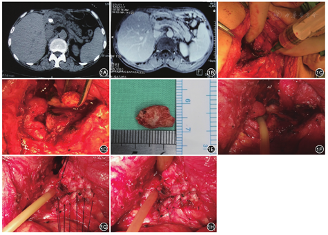 患者 女性,62岁。因胰十二指肠切除术(pancreaticoduodenectomy,PD)术后7年,反复发作上腹痛4年余,加重5 d于2017年3月22日收入院。患者于2010年4月因梗阻性黄疸、胆总管下段占位于我中心行PD。术前CA19-9为83.53 U/ml,超声和CT等影像学检查结果示胆总管下端占位,继发肝内外胆道扩张,胰管未见扩张。术中胰肠吻合采用胰管空肠黏膜吻合方式,以4-0不可吸收线行全层连续缝合,并于胰管内置胰液引流管内引流。术后病理学检查结果示胆总管下段高-中分化浸润性腺癌,胆道切缘阴性;术后CA19-9降至正常;术后未行辅助治疗。术后6个月和1年随访时患者未诉不适,影像学检查未发现异常。2012年8月患者因左肝管中分化乳头状腺癌于外院行左半肝及尾状叶切除术,术前CA19-9为152.6 U/ml,术后降至正常。患者第2次手术后,自述反复发作性上腹痛,因疼痛较轻,于当地诊所行抗炎、抑酸、抑酶等对症治疗后好转,遂未行进一步检查。2016年11月患者疼痛加剧,于我院行腹部CT检查,结果显示胰腺多发钙化,可见胰管结石和胰管轻度扩张。患者因经济和自身等因素拒绝手术治疗,予对症治疗后好转出院。本次入院前患者上腹部呈持续性锐痛,强迫体位,呈弯腰、屈膝侧卧位。入院体检:体温36.3 ℃,脉搏95次/min,呼吸18次/min,血压103/79 mmHg(1 mmHg=0.133 kPa)。上腹部见正中绕脐手术切口瘢痕,长约20 cm,上腹压痛阳性,剑突下触及大小约5 cm×5 cm质硬肿块,压痛阳性,活动度差。入院后急查血淀粉酶为211 U/L,尿淀粉酶为1 210 U/L。腹部CT图像显示,胰头区高密度伴胰管扩张(图1A)。实验室检查:CA19-9为32.2 U/ml,癌胚抗原为1.12 μg/L。磁共振胰胆管造影(magnetic resonance cholangiopancreatography, MRCP)检查显示,右侧肝内胆管未见明显扩张,因多次手术,胰管显示欠佳。肝脏多期动态增强MRI(图1B)扫描示肝脏形态,各叶比例尚可,肝右叶信号异常,考虑小囊肿,胰管扩张。综合患者病史、体检及以上检查结果考虑患者反复发作腹痛系因胰十二指肠切除术后远期并发胰肠吻合口狭窄、胰管结石形成导致慢性胰腺炎反复急性发作。