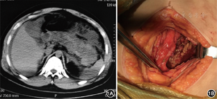 2017年6月25日复查PCT为2.34 μg/L,CRP为183.70 mg/L,次日患者出现寒战、体温达40 ℃,左肾前间隙引流出褐色液体约60 ml。CT检查结果示胰尾增粗、密度减低,其内可见气体密度影,假性囊肿形成,给予亚胺培南(0.5 g,每8小时)治疗、引流管冲洗,建议患者手术扩创,家属决定暂观察、拒绝手术。患者间断性发热,PCT及CRP水平不稳定,再次建议患者手术,家属同意手术治疗。2017年7月6日于全身麻醉下行胰周坏死组织清创引流术。手术取左肋缘下斜行切口,长约10 cm,逐层切开入腹,探查腹腔见大网膜与肝周及脾周粘连严重,沿左侧腹腔穿刺管切开长约5 cm切口,逐层切开入腹,打开降结肠侧腹膜,将降结肠向右侧掀起,沿结肠后与左肾间隙向上打通腹膜后脓腔,见大量脓血性液体流出,探查脓腔,清除部分坏死组织(图1B),纱布填塞压迫止血,冲洗创腔,充分止血后放置引流管3枚,由侧腹壁引出,逐层关腹并固定引流管。
