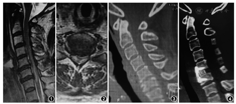 患者女性,52岁,因"甲状腺术后双手伴双下肢活动障碍1 d"于2017年5月21日急诊入院。1个月前患者颈部发现一活动结节,就诊于当地医院,行相关检查后(未行颈椎相关检查)不排除甲状腺癌。入当地医院后询问病史无颈部不适及四肢麻木无力、踩棉感等症状,颈椎及神经系统体检示:颈椎曲度变直、序列及活动度正常,颈部无压痛、叩击痛,未查及感觉异常平面,四肢感觉及运动未见明显异常,四肢腱反射正常,无病理反射。完善术前准备后行甲状腺次全切除术。患者取仰卧位,静脉麻醉状态下使用喉镜辅助顺利完成气管插管,麻醉完成后取颈椎背伸体位,充分暴露术野。手术时间约80 min。术后麻醉师唤醒患者,患者自诉双下肢伴双手活动障碍,双上肢感觉针刺、麻木感,初考虑患者意识尚未清醒,30 min后患者意识清晰,查双下肢和双手无明显活动,症状无明显改善,于当地医院急行颈椎X线检查及颈椎CT后未见明显异常,后转入普通病房详观,2 d后患者症状无明显改善,急诊转入我院行进一步治疗。入院体检:颈椎生理曲度略直,序列如常,颈部前方横切口,敷料包扎,负压引流,颈部无明显压痛、叩击痛,感觉平面在胸骨角水平,双前臂及手部感觉针刺、麻木感,四肢肌肉张力不高,双侧三角肌、肱二头肌肌力4级,双侧肱三头肌肌力3+级,双手握力0级,双下肢各肌肌力0级,双侧肱二头肌反射正常引出,双侧肱三头肌反射未引出,双侧膝腱反射、跟腱反射未引出,双侧霍夫曼征阴性,双侧巴宾斯基征阳性,余体检未见明显异常。日本骨科协会评分3分(17分法)。颈椎MRI示C4~7椎间盘向后突出,以C5~6椎间盘水平为著,黄韧带无肥厚,C4~7椎体后方水平颈髓内可见条片状T1WI低信号T2WI高信号脊髓水肿影(图1)。C5~6椎间盘水平椎管狭窄,黄韧带肥厚(图2)。颈椎CT示颈椎曲度变直,局部反张,诸椎体边缘可见骨质增生,以C6椎体为主;C4~7椎间盘突出伴相应椎管狭窄,以C5~7为著(图3)。结合相关检查及体检,诊断为颈部脊髓损伤、四肢不全瘫、颈椎管狭窄症、甲状腺术后,收入我院拟行急诊手术治疗。
