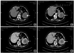 患者女性,72岁,因"体检发现脾脏占位5年"于2018年6月26日收治入院。体检未见明显异常。门诊超声检查结果显示:脾脏占位,包膜完整,边界清楚,大小约63 mm×64 mm。2018年4月13日患者于我院血液科行骨髓检查,结果提示,有核细胞增生活跃,粒细胞增生活跃,比例(63%)偏高,形态大致正常,红细胞增生活跃,比例(25%)及形态大致正常,淋巴细胞占5.5%,浆细胞占4%,血小板散在分布。入院后查血常规:红细胞计数3.51×1012/L,血红蛋白104.0 g/L,血细胞比容31.3%,白细胞计数7.0×109/L,血小板计数181×109/L;丙肝病毒IgG抗体阴性;乙肝表面抗体阳性;HIV、梅毒等抗体阴性;心电图、超声心动图未见明显异常;肝肾功能、血脂水平、肿瘤指标均未见异常;凝血功能:D-二聚体394 μg/L(参考值:0~300 μg/L)。腹部CT检查提示脾脏形态尚可,其内见一个类圆形低密度影,大小约71 mm×64 mm,增强后呈不明显均匀强化,病灶边缘尚光整,边界清晰,诊断为脾脏占位性病变(图1)。