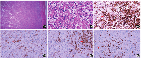 患者于2018年6月28日行腹腔镜探查术,盆腔、结肠、小肠、肝脏、胃、网膜未见明显异常。脾脏外形与质地正常,脾脏中上极膈面见一个最大径约70 mm肿块,灰白色,边界清楚,薄膜完整,质地韧,探查脾门未见明显肿大淋巴结,遂行腹腔镜下脾切除术。手术顺利,患者术后恢复良好。术后标本所见:脾脏大小13 cm×8 cm×7 cm,被膜下见一个肿块,大小8 cm×7 cm×6 cm,切面灰白,质中,中央见坏死,边界尚清。病理学诊断:(脾脏)结合免疫病理学检查结果,符合边缘区淋巴瘤(浆细胞为主型,低度恶性)诊断(图2)。免疫组化结果(图3):CKpan(-),CD3(背景+),CD5(-),CD43(背景+),CD20(小灶+),Pax5(小灶+),CD38(+),CD138(+),CD21(-),CD23(-),Bcl-2(灶+),Bcl-6(-),MUM1(部分+),CyclinD1(-),CD10(部分+),Ki-67(部分+),CD30(-),CD15(+/-)。术后随访至2019年3月,患者一般情况良好,复查超声未见明显异常。