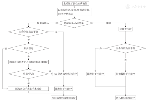 生命体征不稳定的患者,则应就地隔离,并迅速判断其病因:(1)明确主动脉破裂为首要原因的患者,原则上应积极在指定隔离复合手术室进行抢救性手术治疗,术后转入隔离病房或定点救治医院并完成后续治疗;(2)考虑为重症肺炎引起生命体征不稳定的患者,应与呼吸科、感染科和重症医学科医师会诊并综合评估手术治疗的获益和风险,如获益大于风险,则在指定隔离复合手术室进行急诊手术治疗;反之则直接进入ICU隔离病房或定点救治医院行保守治疗,待肺炎病情稍稳定后可立即行手术治疗。