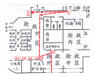 3.无论患者是从急诊室还是隔离病房转运至手术室,都应根据医院的具体情况选择专用的污染通道,确保在与其他患者或医护人员接触最少的情况下完成转运,从而尽量降低交叉感染的机会。此外,在主动脉急症患者的救治过程中,也应考虑减少流程、减少搬动。我院采用从急诊室、CT室和手术室的"door-to-door"最优路线完成主动脉急症患者的救治转运(图2)。