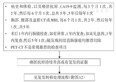 (6)结直肠癌患者在诊断和治疗前,评价疗效和随访时必须检测外周血癌胚抗原、CA19-9;有肝转移患者建议检测甲胎蛋白;疑有腹膜、卵巢转移患者建议检测CA125。