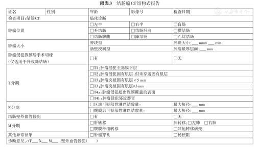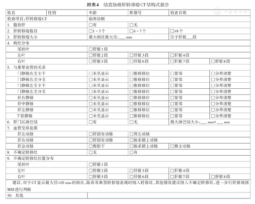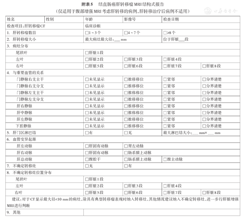 对于腹部检查考虑肝转移的病例,可使用结直肠癌肝转移瘤CT及MRI结构式报告,模板见附表4,5。