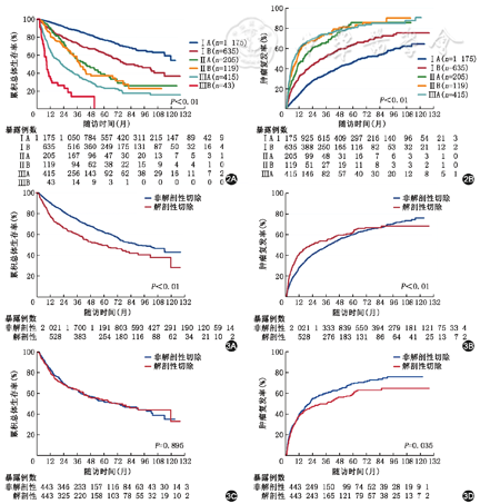 由表4可见,非解剖性切除组和解剖性切除组中患者的基本情况和肿瘤特征不均衡,进行1∶1倾向性评分匹配后得到443对患者,再次比较两组间的基本情况和肿瘤特征,差异无统计学意义(P值均>0.05)。2 549例首次接受肝切除的肝细胞癌患者中,行非解剖性肝切除2 021例,行解剖性肝切除528例。未调整混杂因素时,非解剖性肝切除术后患者的总体生存率高于解剖性肝切除(P<0.01)(图3A),非解剖性肝切除复发率低于解剖性肝切除(P<0.01)(图3B)。进一步比较443对匹配后的患者生存分布可见,非解剖性肝切除术后患者的生存率与解剖性肝切除的差异无统计学意义(P=0.895)(图3C),但非解剖性肝切除术后患者的复发率高于解剖性肝切除(P=0.035)(图3D)。这一结论亦与表3中的多因素模型的结论一致。