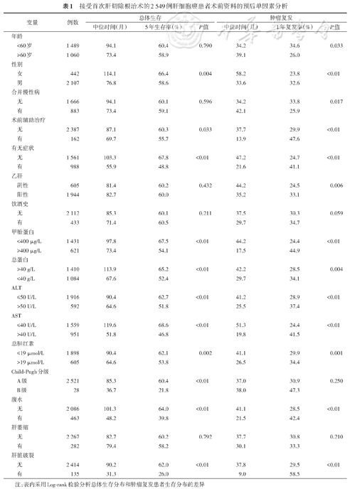 接受首次肝切除根治术的2 549例肝细胞癌患者术前资料的预后单因素分析