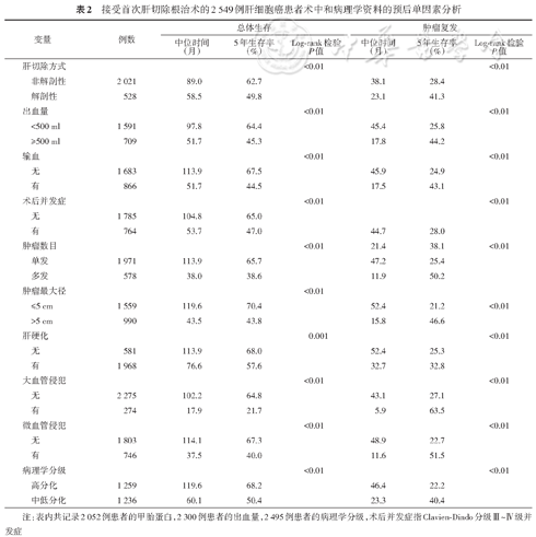 接受首次肝切除根治术的2 549例肝细胞癌患者术中和病理学资料的预后单因素分析
