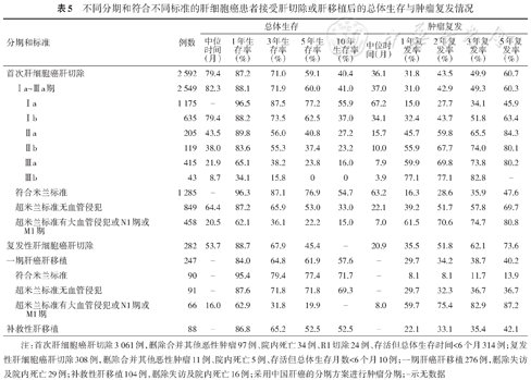 不同分期和符合不同标准的肝细胞癌患者接受肝切除或肝移植后的总体生存与肿瘤复发情况