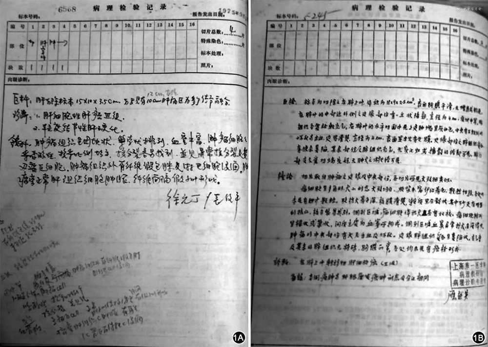 患者一般情况好、无手术禁忌证,遂于1975年9月2日在全身麻醉下行开腹探查(手术医师:汤钊猷、余业勤)。术中见肝脏质地基本正常,无明显肝硬化;肿块位于肝脏左叶、质硬、最大径12 cm,边界清楚,肉眼所见为癌;余肝未见播散结节;未见肝门部淋巴结肿大及腹水。逐行根治性左半肝切除术。术后测量标本,肿瘤大小 12.0 cm×7.5 cm×6.0 cm。术后病理学报告:(1)肝细胞癌Ⅲ级;(2)轻度结节性肝硬化(病理医师:徐元丁)(图1A)。患者术后恢复基本顺利。术后1个月余甲胎蛋白转为阴性。手术后采用小剂量全身化疗(氟尿嘧啶和噻替派)、免疫治疗(卡介苗足三里穴位注射)和中药治疗,以巩固手术疗效。