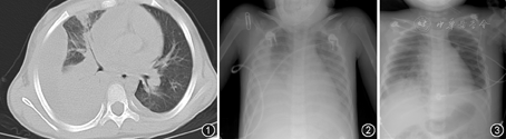 女,3岁,因"发热、咳嗽9 d,呼吸急促4 d"入院。患儿入院前9 d出现发热伴咳嗽,入院前8 d在院外口服头孢羟氨苄颗粒治疗,咳嗽加重,体温不退。入院前5 d于当地医院拍胸X线片提示"右肺炎症",给予静脉滴注头孢美唑抗感染,入院前4 d患儿出现呼吸急促,换用头孢哌酮舒巴坦联合阿奇霉素抗感染。入院当日患儿呼吸急促较前加重,体温高达39.9 ℃,复查胸X线片提示"右肺炎症加重并右侧胸腔积液",转入我院。患儿既往体健。