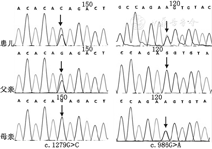 患儿女,4岁。因"间断抽搐2年余"于2016年2月就诊于北京大学第一医院。患儿足月自然生产,生后无窒息史。13月龄无明显诱因首次出现发作,表现为双眼左斜,左侧肢体抽搐,牙关紧闭、面色青紫,持续约5 min,24 h内发作3次,未予治疗。间隔7个月后出现第2次发作,仍为24 h内发作3次,表现同前,予托吡酯治疗。2岁2月龄时再次出现发作,表现为头、眼向一侧偏斜,不伴肢体抽搐,予托吡酯加量后发作控制不佳。后发作逐渐频繁,平均1~2个月发作一簇,于1~2 d内频繁发作,最多时1 d可发作7~8次,多表现为一侧身体抽搐,偶尔出现四肢抽搐,应用托吡酯、丙戊酸、硝西泮联合治疗,发作频率、程度均无明显改善。期间行脑电图检查示前头部、后头部及广泛性游走性慢波节律(图1)。确诊前末次发作为3岁10月龄时,24 h内发作7~8次。血液生化、氨基酸,尿液有机酸筛查等均未见异常。磁共振成像(MRI)检查示双侧侧脑室后角旁脑白质轻度髓鞘化不全,额部脑沟轻度增宽。患儿1岁6月龄会走路,至4岁时仍走路不稳、易跌倒;语言表达能力差,仅能说简单词语;精神较差,双眼无神,交流少。Gesell发育评估(4岁时)示轻-中度发育落后。此次于我院疑诊为限于女性的癫痫伴智力低下(EFMR)并行癫痫相关基因包检测,意外检出ALDH7A1基因复合杂合突变(NM_001182.4):c.1279G>C(p.Glu427Gln)和c.986G>A(p.Arg329Lys)(图2),分别遗传自父母,c.1279G>C为已报道致病性突变,c.986G>A未见国际报道,经保守性及致病性分析认为可致病,确诊为吡哆醇依赖性癫痫(PDE)。确诊后预计添加大剂量维生素B6,治疗当天出现1次发作,表现为双眼右斜,持续2 min,给予维生素B6 180 mg/d分3次口服后发作控制,未出现既往均会出现的成簇发作。维生素B6维持治疗1周后逐渐减停抗癫痫药。添加维生素B6治疗前及治疗2个月后的尿液哌啶酸浓度分别为2.09、1.64 mmol/mol肌酐(正常范围:0.12~3.52 mmol/mol肌酐)[1]。随访6个月,目前仅口服维生素B6 180 mg/d,未再出现癫痫发作。家长诉患儿精神状态较前明显好转,反应较前增快,记忆力明显增强;走路变稳,很少跌倒,可以跑;说话较前明显清晰,可以简单沟通。
