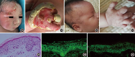 患儿男,3日龄,因"躯干、四肢部分皮肤破溃、糜烂3 d"于2016年7月就诊于四川大学华西医院。患儿3 d前即出生时被发现头面部、四肢及腹股沟处皮肤部分破溃、糜烂,系第1胎第1产,自然出生,出生胎龄36周,生后1、5 min Apgar评分均为10分,产程中无外伤。其母36岁,2016年4月因"口腔糜烂1个月"于华西口腔医院就诊,其时孕24周,未行病理活检,于我院完善外周血抗桥粒芯糖蛋白(Dsg)1抗体和3抗体检测,分别为1.69×105 U/L(>0.15×105 U/L为阳性)、1.97×105 U/L(>0.1×105 U/L为阳性),诊断为"寻常型天疱疮" ,并接受口服泼尼松(30 mg/d)治疗,口腔病损有所控制,其后不规则服药,其母亲孕期产前检查包括梅毒等性病检查无异常。患儿入院体格检查:前额、右上肢、腹股沟区见部分皮肤缺失露出鲜红色糜烂面,边缘有脓疱,伴少量渗出,可见脓痂(图1),口腔及生殖器黏膜未见水疱或糜烂。实验室检查:血、尿、粪常规,生化检查,输血前全套检查均正常;皮损分泌物细菌培养阴性。患儿外周血抗Dsg1、Dsg3抗体分别为0.09×105 U/L、1.5×105 U/L,复查母亲外周血抗Dsg1、Dsg3抗体分别为1.15×105 U/L、1.94×105 U/L。患儿皮损边缘组织病理学(图2):表皮棘细胞内水肿;直接免疫荧光:角质形成细胞间网状IgG(+)、C3(+)。