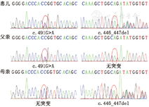 在知情同意的前提下,抽取患儿及其父母静脉血各2 ml,提取白细胞DNA,进行基因分析。参考文献[1]合成引物,对GSS基因的所有外显子进行PCR扩增,扩增片段包括内含子和外显子引物接头处,用LifeTouch基因扩增仪[TC-96/G/H(b)B]进行PCR-DNA扩增反应。PCR产物经纯化后测序,测序结果在NCBI-BLAST中进行序列对比(http://www.ncbi.nlm.nih.gov/BLAST/)。图1示患儿GSS基因第5外显子检出两处杂合突变,c.491G>A (p.R164Q)为父源突变,人类基因突变数据库报道为已知致病突变。c.446_447del (p.S149fs)为母源突变,未见文献报道,在人类单核苷酸多态性(SNP)数据库及千人基因组计划中均未见收录,200名正常对照中未检出。确诊患儿为谷胱甘肽合成酶(glutathione synthetas,GSS)缺乏症。