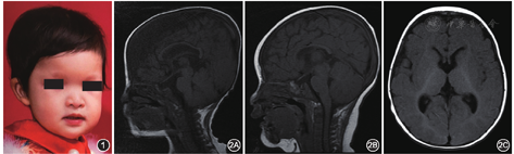 入院体格检查:体温37.6 ℃,身高64 cm,体重7.5 kg,呼吸平稳,反应迟钝,腹部无明显腹胀,可见腹腔镜手术瘢痕;面容特殊,主要表现为眼距宽、眼眶深陷、低鼻梁、鹰钩鼻、小下颌(图1);无法抬头,无法独自翻身,不能独坐。