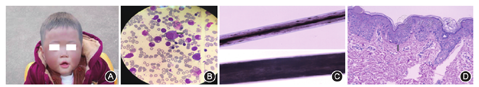 诊疗与随访:入院后根据患儿临床有发热,皮疹,咽峡炎,肝脾大,异淋升高,EB病毒阳性,初步考虑为传染性单核细胞增多症。但因患儿10月龄发病,局部有白化病,头发灰黄,局部皮肤色素脱失(图1A),视网膜色素减少,且骨髓粒细胞见包涵体(图1B)。光镜下患儿头发色素明显减少,呈小点状分布,非大块状分布(图1C)。电镜下患儿后背部皮肤活检示皮肤基底细胞水肿,真皮浅层血管周围有少量淋巴细胞浸润,黑色素颗粒异位缺失(图1D)。结合父母有近亲结婚,其大姐因类似临床症状逝世,临床考虑Chediak-Higashi综合征(Chediak-Higashi syndrome,CHS)可能。