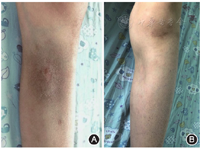 入院体格检查:体重30 kg,身高136.5 cm,体温36 ℃,心率115次/min,呼吸22次/min,血压111/65 mmHg(1 mmHg=0.133 kPa)。神清反应可,双下肢及左下腹可见散在浅褐色瘀斑(图1),直径2~8 cm,皮疹下可扪及皮下结节,直径2~4 cm,质硬,边界清晰,轻度压痛,局部皮温不高,浅表淋巴结无肿大,心肺查体无特殊,腹部稍膨隆,肝脏右肋下平脐,质中,边缘锐利,脾脏肋下及边,神经系统查体无异常,毛细血管充盈时间<2 s。