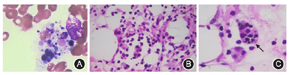 实验室检查:血常规示白细胞0.54×109/L,中性粒细胞0.09×109/L,淋巴细胞0.43×109/L,血红蛋白98 g/L,血小板44×109/L,网织红细胞26.40×109/L;尿常规、粪常规无异常;生化示丙氨酸转氨酶90 U/L,天冬氨酸转氨酶205 U/L,乳酸脱氢酶3 115 U/L,肌酐48.7 μmol/L,尿素氮3.9 mmol/L,肌酸激酶61 U/L;甘油三酯(空腹)3.67 mmol/L(参考值范围<1.7 mmol/L);铁蛋白29 900.4 μg/L(参考值范围22~322 μg/L);红细胞沉降率11 mm/1 h;凝血功能示纤维蛋白原0.57 g/L(参考值范围2~4 g/L);降钙素原0.13 μg/L,血培养、骨髓培养、EB病毒抗体IgM、EB病毒DNA、乙型肝炎病毒五项、丙型肝炎病毒抗体、人免疫缺陷病毒抗体、梅毒螺旋体特异抗体、结核菌素试验、结核免疫分析、真菌G试验、寄生虫检测及呼吸道病原检测等均未见明显异常。骨髓涂片提示骨髓增生极度减低,可见噬血细胞(图2A);肿瘤标志物阴性。Coomb试验阴性;抗核抗体、自身抗体谱、抗中性粒细胞胞浆抗体阴性;体液免疫示IgM 0.64 g/L、IgG 12.9 g/L、IgA 2.16 g/L;淋巴细胞亚群示总T淋巴细胞0.829、辅助T淋巴细胞0.507、抑制T淋巴细胞0.296、辅助与抑制T淋巴细胞比值1.72、B淋巴细胞0.153、NK细胞0.012、淋巴细胞计数467×106/L、总T淋巴细胞计数387×106/L、辅助T淋巴细胞计数235×106/L、抑制T淋巴细胞计数137×106/L、B淋巴细胞计数72×106/L、NK细胞计数6×106/L;细胞因子谱示白细胞介素(interleukin,IL)2 0.2 ng/L、IL-10 578.6 ng/L(参考值范围2.6~4.9 ng/L)、IL-4 0.1 ng/L、IL-6 9.9 ng/L、肿瘤坏死因子α 1.0 ng/L、γ-干扰素369.7 ng/L(参考值范围1.6~17.3 ng/L)。噬血相关检查示NK细胞活性14.19%(参考值范围≥15.11%);可溶性CD25水平1 127 ng/L(参考值范围<6 400 ng/L);信号淋巴细胞活化相关蛋白、X连锁凋亡抑制因子、穿孔素及颗粒酶B表达均无异常。皮下结节病理示脂肪小叶炎(图2B),可见"豆袋细胞"(图2C),未见肿瘤细胞;免疫组织化学示CD20(个别+),CD3(多数+),CD38(少量浆细胞+),CD4(部分+),CD8(部分+),TIA-1(部分+);EBER原位杂交阴性。