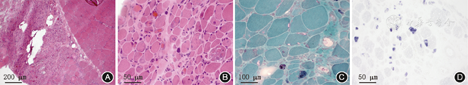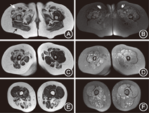患儿 女,9岁,主因"肢体无力2年3个月余,加重7个月"于2018年1月就诊北京大学第一医院。患儿早期智力、运动发育正常。5岁9月龄起无明显诱因在做操时发现双上肢上举费力,右侧为著,当时双下肢活动尚可,跑跳正常。当地医院查血清肌酸激酶(creatine kinase,CK)466 U/L(正常值25~170 U/L);血串联质谱分析、尿气相色谱-质谱分析、肌电图、头颅磁共振成像(magnetic resonance imaging,MRI)、脊髓MRI及肺功能均未见异常,未予进一步诊治。患儿双上肢无力呈缓慢加重,至8岁5月龄时,双上肢无力明显加重,刷牙、举杯喝水均费力,穿衣困难,并出现双下肢无力,表现为跑跳差、蹲起费力、上楼梯困难,右侧肢体无力较左侧著。至9岁时进展至走路易摔倒、平卧位不能自行坐起。病程中不伴有发热、皮疹,无呼吸困难、饮水呛咳及吞咽困难。既往史、个人史无特殊。家族中无类似患者,患儿弟弟5岁,体健。入院体格检查:神志清,反应可,心、肺、腹未见异常;走路不稳,Gowers征(+),左侧肢体近端肌力3级,远端肌力4级,右上肢近端肌力2级,右下肢近端肌力3-级,远端肌力4级,四肢肌张力减低,无共济失调体征,四肢腱反射均未引出,双侧巴氏征阴性。住院后复查CK 299 U/L;因考虑四肢肌力不对称,近半年病情进展较快,不除外炎症性肌病,查红细胞沉降率、免疫球蛋白、补体、自身抗体谱、甲状腺功能及甲状腺抗体均正常;肌炎相关抗体PL7抗体阳性(+++),余阴性;双侧臀部及大腿肌肉MRI提示水肿、脂肪浸润改变,左右病变不对称,右侧著,其中肌群受累呈选择性:闭孔内外肌、大腿后群(半膜肌、半腱肌及股二头肌)和部分内侧肌群(股薄肌)受累较重,而臀大肌未受累,大腿前群肌肉(股中间肌、股外侧肌、股内侧肌、缝匠肌)受累较轻(图1)。肌电图显示左肱二头肌运动单位电位时限缩短,提示肌源性损害可能性大。进一步行左肱二头肌活检光镜下显示多灶性分布的肌肉萎缩、不同程度坏死和再生,肌纤维内不规则空泡和嗜酸性胞质体,不能除外炎症性肌病(图2);主要组织相容性抗原-Ⅰ(major histocompatibilityantigen-Ⅰ,MHC-Ⅰ)免疫组织化学染色示部分萎缩肌纤维呈阳性表达,亦提示炎症性肌肉病理改变可能。