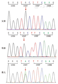 本文中第147页摘要第7行、第148页右栏第7行、图3图说明中“c.311G>A,p.C104T"更正为"c.311G>A,p.C104Y"。图3中父亲和母亲红色箭头上的”104T"更正为"104C“,患儿红色箭头上的"104T"更正为"104Y"。更正的同时表示歉意!