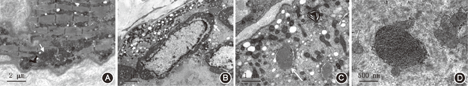 治疗及转归:结合患儿肌肉MRI和肌肉病理,考虑"炎症性肌病"可能性大,但患儿病程较长,不能除外遗传性肌病,故同时送检家系全外显子基因测序以协助诊断。给予丙种球蛋白(2 g/kg)静脉输注、甲泼尼龙冲击[20 mg/(kg·d)×3 d]并序贯足量泼尼松口服、辅酶Q10口服,辅以康复训练,患儿走路姿势略好转。但患儿出院后1个月随访,病情未进一步好转。此时家系全外显子测序回报,示FHL1基因c.311G>A,p.C104T,为已知杂合新生致病性变异,父母均为正常基因型(图3)。进一步对患儿肌肉活检组织进行甲萘醌-硝基四氮唑盐(menadione-nitrobluetetrazolium,M-NBT)染色,胞质内可见蓝紫色包涵体(图2);肌肉电镜发现肌膜下及肌原纤维之间大量高嗜锇颗粒,部分形成大的包涵体,可见少数指纹样小体(图4)。根据M-NBT染色见蓝紫色包涵体,及FHL1基因发现致病性变异,最终确诊还原体肌病。减停泼尼松,继续康复训练,定期随访1年半,患儿肢体无力呈缓慢加重,尚可独走,但较易摔倒。