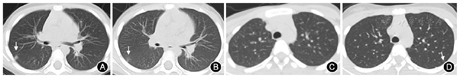 采用日本东芝TSX-101A 64层螺旋CT。扫描参数为120 kV,管电流自动调节,螺距0.8,矩阵512×512,显示视野(field of view,FOV)320 mm×320 mm,层厚5.0 mm,层距1 mm,由肺尖到肺底连续扫描。扫描结束后以1 mm高分辨率肺窗重建。(1)发热患儿在发热就诊时行初次胸部CT检查;对于未发热患儿,均在病毒核酸初次筛查时行初次胸部CT检查。(2)入院后治疗3~5 d再次复查胸部CT。(3)所有影像学资料均在医学影像信息系统上由放射科2名副主任医师或主任医师共同观察肺部病变分布位置、形态。