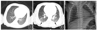 | 3 | 男 | 12 | 喷嚏、吐奶、腹泻 | 监护、增加喂养、对症支持治疗 | 增厚 | 消失 | 有 | 无 | 无 | 双肺小条状模糊影 |