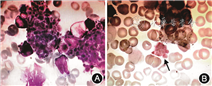 实验室检查(括号内为参考值):血常规示白细胞计数10.8×109/L(4.0×109~10.0×109/L),血红蛋白137 g/L(110~160 g/L),血小板计数12×109/L(100×109~300×109/L)。外周血涂片示可见大血小板,胞体大,可见聚集,血小板计数与仪器检测结果基本相符。凝血示凝血酶原时间12.4 s(9.4~12.5 s),部分凝血活酶时间24.7 s(25.1~38.4 s),纤维蛋白原0.94 g/L(Clauss法,2.0~4.0 g/L)。血生化示电解质、肝肾功能、乳酸脱氢酶等均在正常范围。住院期间血小板波动于(12~65)×109/L。粪常规示潜血阳性,红细胞3个/高倍镜视野。尿常规正常。骨髓细胞学检查示骨髓增生活跃,全片共找到42枚巨核细胞,偶见小巨核细胞,多数血小板体积偏大,可见巨大血小板和明显聚集现象(图1A)。小巨核细胞免疫酶标染色(CD41a)可见正常巨核细胞10个,大单圆核小巨核细胞3个,单圆核小巨核细胞4个,淋巴样小巨核细胞6个,全片巨核细胞23个(图1B)。抗血小板抗体、抗核抗体、抗双链DNA抗体、抗可溶性核抗原抗体谱阴性。血小板聚集率示二磷酸腺苷(adenosine diphosphate, ADP)、花生四烯酸和胶原刺激血小板聚集均降低,低浓度(0.5 g/L)的瑞斯托霉素诱导的血小板聚集(ristocetin-induced platelet aggregation, RIPA)阳性。血管性血友病因子(von Willebrand factor, vWF)抗原水平119.4%(66.1%~176.3%),凝血因子Ⅷ、Ⅸ、Ⅺ、Ⅻ促凝活性均正常。