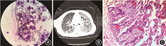 辅助检查:血常规示白细胞11.2×109/L,中性粒细胞0.60,嗜酸粒细胞0.02,血红蛋白133 g/L,血小板140×109/L,C反应蛋白2 mg/L。肝肾功能、过敏源及免疫球蛋白、T细胞亚群均未见异常。结核感染T细胞斑点检测、自身抗体20项、EB病毒抗体、巨细胞病毒抗体、1, 3-β-D葡聚糖试验、半乳甘露聚糖试验、呼吸道病毒免疫荧光7项、肺炎支原体RNA、痰细菌及念珠菌、曲霉菌培养、巨细胞病毒DNA均阴性。胸部CT示两肺大部呈磨玻璃状,内见支气管充气征及多发小囊状透亮区,小叶间隔增厚(图1B)。头颅磁共振成像示双侧脑室体后部斑片状长T2信号影,胼胝体偏薄,其余未见异常。腹部超声示脾脏肋间厚3.5 cm,肋下4.5 cm。入院第6天行纤维支气管镜检查及灌洗治疗,镜下见气管及各支气管管腔通畅,黏膜充血水肿,管腔内见少许白色黏稠分泌物,予生理盐水灌洗,洗出黏液栓样液体。入院第9天行胸腔镜下肺活检,病理示镜下见肺泡区域间隔增宽,泡沫细胞浸润及纤维组织增生,肺泡腔内见大片泡沫状细胞(图1C)。北京协和医院病理科会诊示(左上肺)肺泡腔及间质内见大量泡沫状细胞聚集,病变以小叶周边部位分布为主,部分间质增宽,病变符合脂质性肺炎,倾向内源性,需要除外先天性基因及代谢异常;免疫组化示AE1/AE3(-),CD163(+),CD68(+),S-100(+);糖原染色阴性。