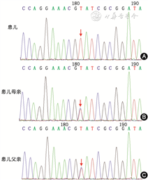 诊疗及随访:住院后给予抗感染、吸氧、雾化吸入等治疗,住院30 d,患儿气促、咳痰减轻,胸部CT较前相仿,予出院。基因检测出院后结果回报14号染色体的NPC2基因外显子1存在纯合错义变异,表现为c.3G>A(编码区第3号核苷酸由鸟嘌呤变异为腺嘌呤),导致氨基酸改变 p.M1I(第1号氨基酸变异为异亮氨酸);经家系验证,患儿父母双方均检测到该位点相同的杂合变异(图2)。最终诊断为尼曼匹克病(Niemann-Pick disease,NPD)C2型;弥漫性间质性肺病。2017年12月患儿因“癫痫持续状态,呼吸衰竭,弥漫性间质性肺病,NPD C2型”再次入住浙江大学医学院附属儿童医院重症监护室,予呼吸机辅助呼吸。家属最终放弃治疗并拒绝随访。