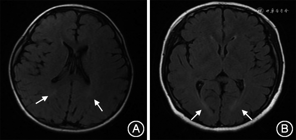 辅助检查:婴儿—初中学生社会生活能力量表为9分;不同年龄阶段格塞尔发育量表结果均显示异常(13月龄大运动发育商68,细动作发育商68,应物能发育商68,言语能发育商60,应人能发育商64;23月龄大运动发育商86,细动作发育商74,应物能发育商69,言语能发育商48,应人能发育商63;3岁3月龄大运动发育商53,细动作发育商48,应物能发育商51,言语能发育商46,应人能发育商51)。心肌酶谱、肌电图、心脏超声均未见明显异常,颅脑磁共振成像显示脑室周围白质异常信号(图1),脑电图未见异常。
