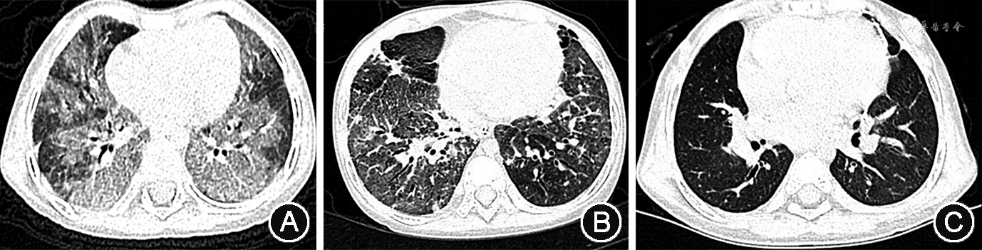 患儿 女,6岁2月龄,因“确诊ABCA3基因变异所致弥漫性肺间质病(diffuse interstitial lung disease,DILD)4年余,接受肺移植6个月,拔除气管套管”于2021年5月在深圳市儿童医院呼吸科病房住院。1岁9月龄患儿因“咳嗽、气促、生长发育落后9个月”于2016年12月在本院就诊,胸部CT提示两肺多发磨玻璃影、透过度不均匀,二代基因测序诊断为ABAC3基因复合杂合变异所致儿童弥漫性肺间质病。确诊初期给予患儿泼尼松、阿奇霉素及羟氯喹三联口服及家庭氧疗(鼻导管1 L/min),间断有咳喘加重或发热,予加强抗感染及抗炎治疗后可缓解。患儿2岁时(2017年3月)复查胸部CT提示患儿双肺弥漫性磨玻璃影进一步加重,双肺透亮度明显降低(图1)。患儿3岁(2018年3月)起因气促、呼吸困难,改为面罩吸氧(4 L/min)。患儿4岁9月龄(2019年12月)因“进行性呼吸困难1年余”再次入住本科,给予经鼻高流量给氧,改为甲泼尼龙每月冲击治疗联合阿奇霉素及羟氯喹口服。患儿5岁(2020年3月)起因“反复出现严重呼吸衰竭,伴有浮肿、腹胀”3次入住本院重症监护病房,胸部CT提示患儿肺部病变明显加重(图1),诊断为“急性肺源性心脏病、重度肺动脉高压、心包积液、腹腔积液、重度营养不良”。患儿5岁6月龄(2020年9月)在外院成功接受双肺移植手术,术后顺利撤出呼吸机,但因出现双侧膈肌麻痹,气管切开中,夜间需接受双水平正压无创通气。患儿系其母第1胎第1产,足月自然出生,出生体重3 150 g,出生情况正常,精神、运动发育正常,体重增长缓慢,5岁6月龄接受肺移植前体重仅11.5 kg。家族中否认类似病史及遗传病史,其父母亲体健,为ABAC3基因变异携带者。