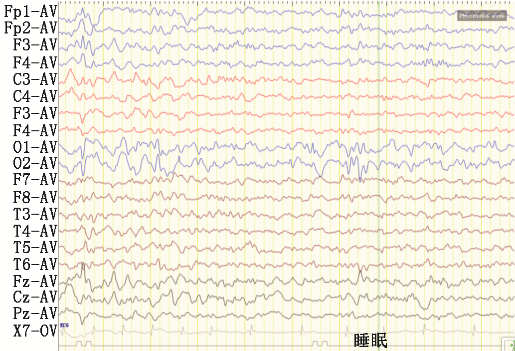 辅助检查:既往外院头颅磁共振成像未见明显异常。入院后完善血常规、尿常规、25羟基维生素D、甲状腺功能三项、叶酸、维生素B12、肝功能、肾功能、心肌酶、离子测定、糖脂五项、同型半胱氨酸、铜蓝蛋白等化验指标均未见明显异常;心电图示窦性心律不齐;2 h视频脑电图示睡眠期双侧枕区为主少量棘波、尖波散发,两侧半球不同步(图1);语言-言语综合能力测查(发育商)显示操作50,接受性语言50,表达性语言25,提示以表达性语言落后为主;韦氏幼儿智力量表显示言语智商<40,操作智商38,总智商32,婴儿-初中学生社会生活能力量表显示中度低下水平,提示智力水平重度缺陷;孤独症行为评定量表(autism behavior checklist,ABC)显示34分,儿童孤独症评定量表(childhood autism rating scale,CARS)显示总分26.5分,≥3分项目3项,提示存在孤独症行为。